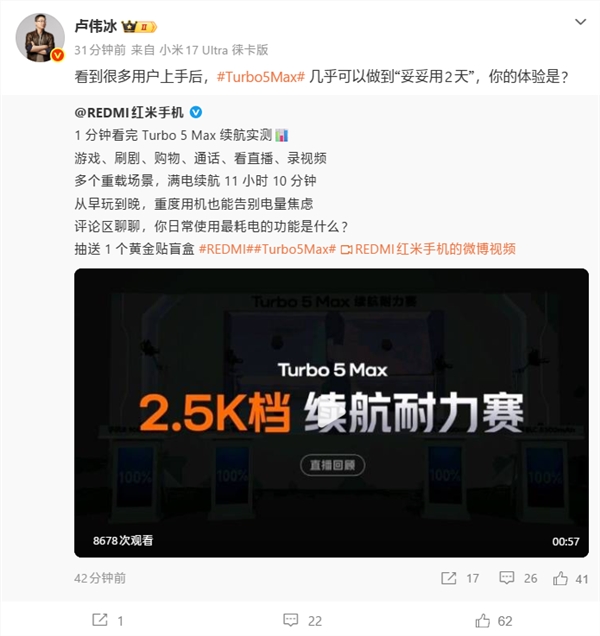 值得一提的是,REDMI Turbo5Max的续航成绩不仅远超搭载9000mAh电池的友商机型,甚至比搭载10000mAh电池的友商机型还要领先,超出时长高达43分钟。如此卓越的续航表现,意味着用户在实际日常使用中,至少可以重度使用一整天而无需任何补电措施。