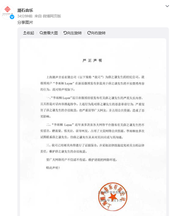 面对李雨桐的持续纠缠,3月3日,薛之谦所属经纪公司@潮石音乐 火速发布严正声明,直接硬刚到底。声明中明确指出,微博用户“李雨桐Luyee”近期发布的多篇内容均为捏造,存在恶意诽谤行为,不仅严重侵害薛之谦的合法权益,还误导公众、占用公共资源。声明还揭露,李雨桐近年来多次散布不实谣言,目的就是蹭流量、博关注,且其曾多次试图联系薛之谦,均未得到回应。目前,公司已完成证据保全,正通过法律途径追究李雨桐的相关责任,并呼吁公众不信谣、不传谣。