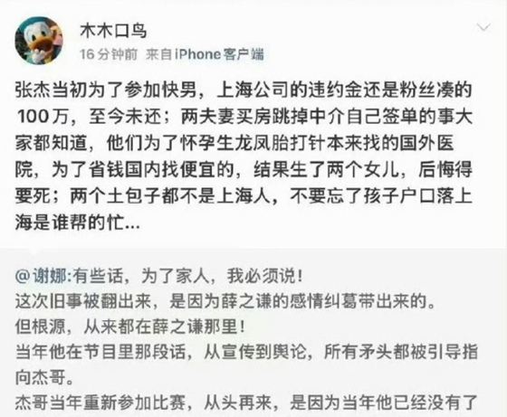 就在薛之谦方忙着应对李雨桐的爆料时,另一波风波再度袭来——谢娜3月3日突然发布长文,直指薛之谦,要求其为9年前在《吐槽大会》上的争议言论,向张杰正式道歉。而这一切的直接诱因,是薛之谦好友“木木口鸟”当日的连环爆料。该好友通过微博连发多条内容,直指张杰谢娜夫妇,爆料内容极具争议,涉及张杰当年靠粉丝众筹100万违约金解约、夫妇买房跳过中介私下签约、生育隐私等敏感话题,甚至暗指谢娜“小三上位”。